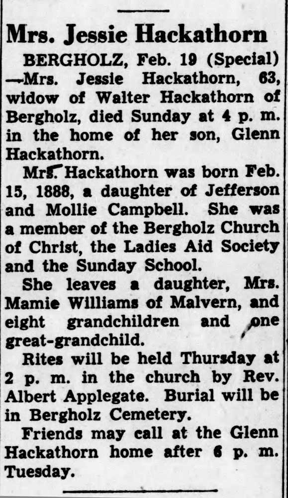 Death: 18 February 1951; Bergholz, Jefferson County, Ohio