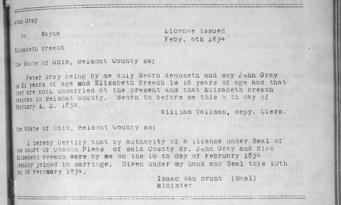 I moved on next to John GRAY, born about 1784, suspected son of Abraham GRAY. What I do know about John GRAY is that he married Elizabeth BREECH on 10 February 1834 in Belmont County, Ohio.