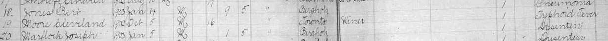 Name: Cleveland MOORE Birth: April 1886; Toronto, Jefferson County, Ohio Death: 05 October 1902; Bergholz, Jefferson County, Ohio Parents: Thomas MOORE and Elizabeth CAMERON Spouse: Never Married Cemetery: Bergholz Cemetery, Jefferson County, Ohio Relationship to Hollie: maternal 1st cousin 2x removed