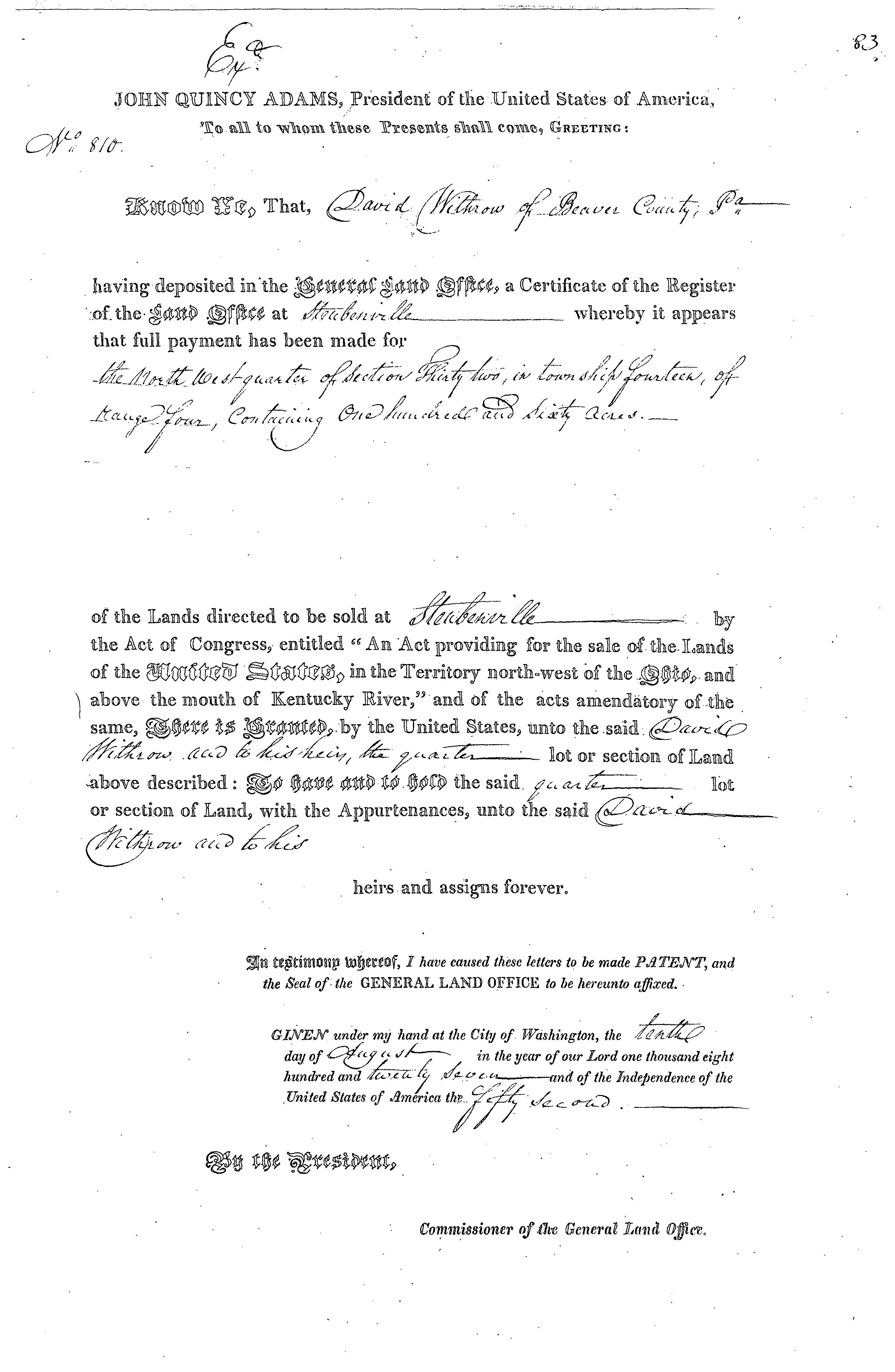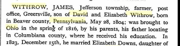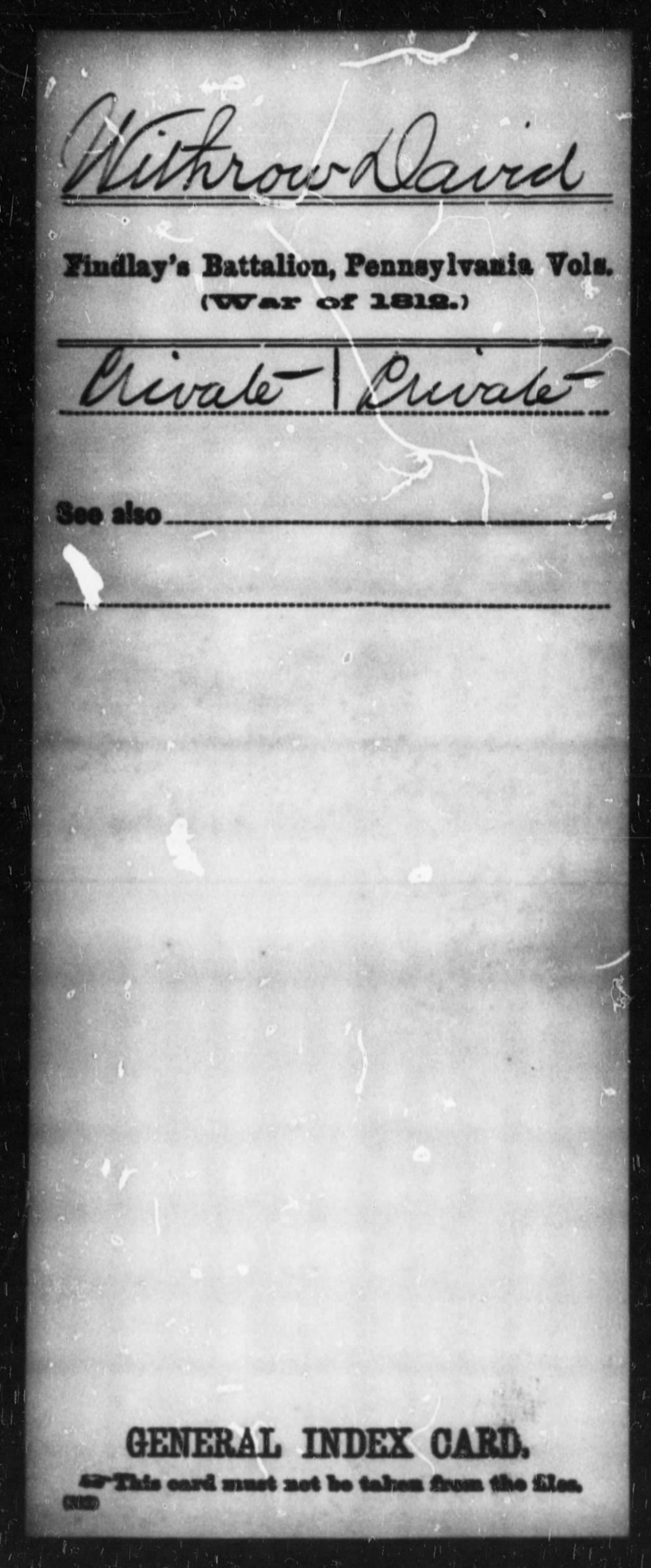 David Withrow also fought in the War of 1812 in Findlay’s Battalion of Pennsylvania Volunteers, so we have to assume that they were still in Pennsylvania at that time.