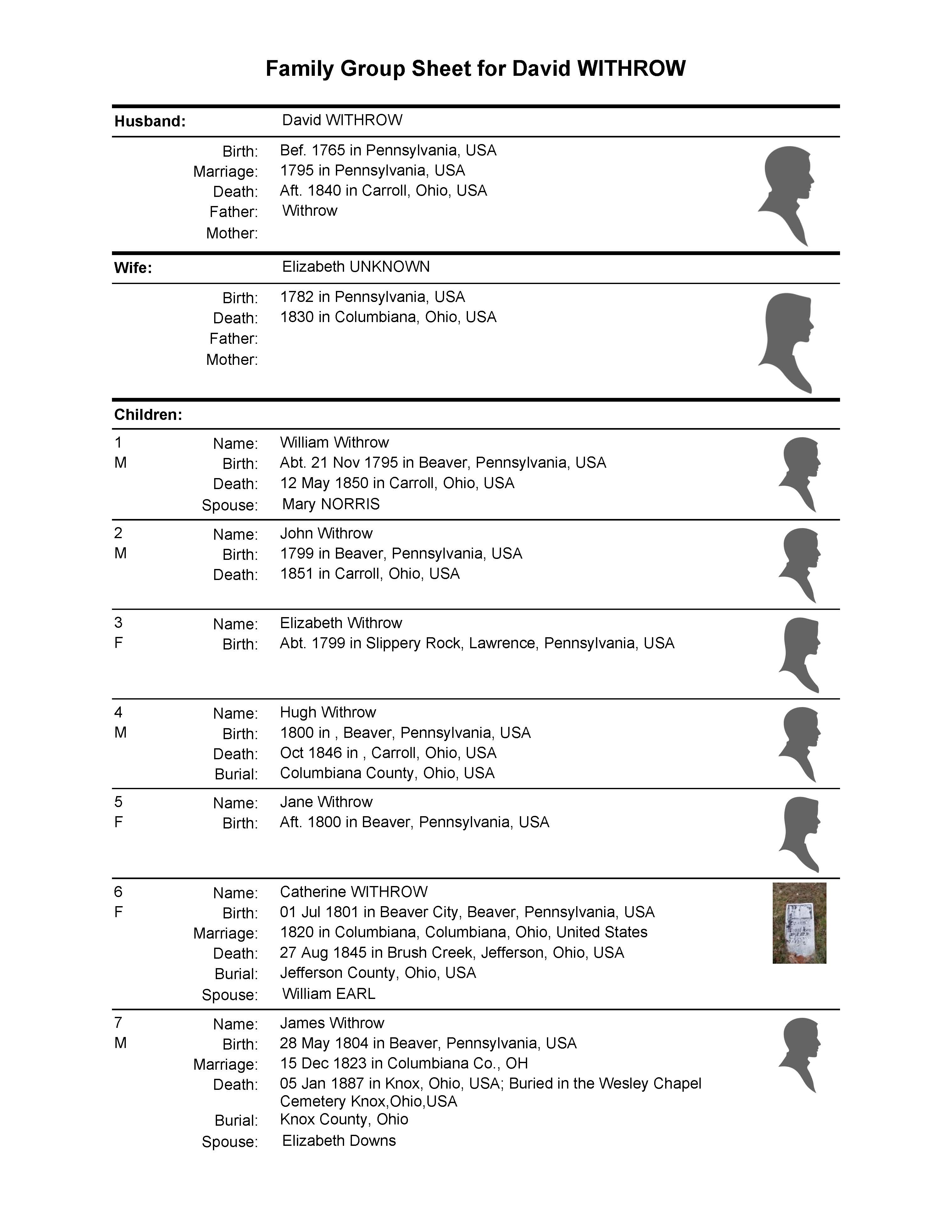 While looking at the household members in the 1830 and 1840 censuses, it appears from the ages of those listed that Elizabeth passes away some time between those censuses. I have yet to locate the graves of David or Elizabeth, but there are Withrows at Glade Run and Mechanicstown (in nearby Fox Township) cemeteries. Following are family group sheets detailing the children of David and Elizabeth Withrow:
