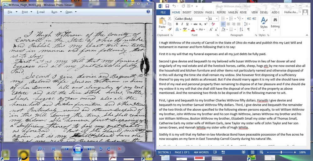 …and then I just read the will out loud, noting if there was something that I wasn’t sure of, and spelling out anything that I might not remember the spelling from the document. Then I just hooked up the recorder to a USB port on my laptop and using my Express Scribe software that I have for transcription work, typed out the will. That went well and lowered my level of frustration a LOT! As a final proof, I’ll pull up the transcription side-by-side with the original: